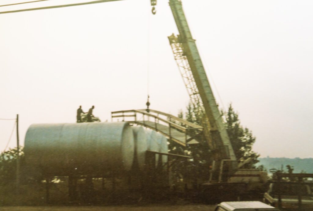 This move was a major local event. A slow-moving convoy began at 5:00 AM in the Mills, traveling down Main Street to Biscay Road. Workers used sticks to raise utility lines so the massive 11×23-foot tanks would not snag. Those same tanks remain in use today at the Biscay Road facility.