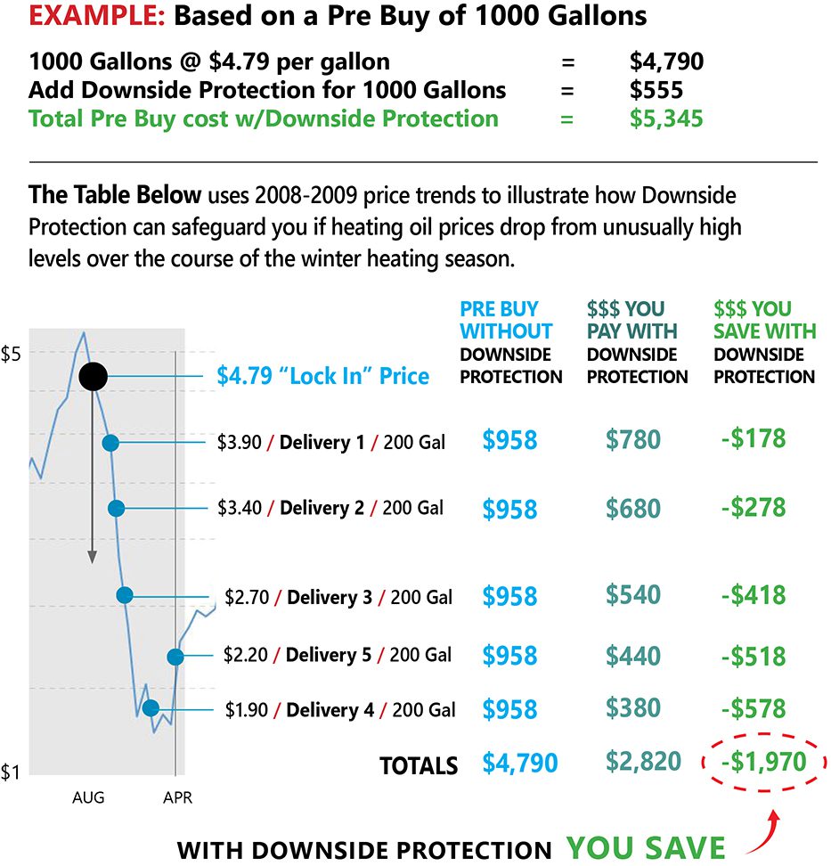 With unstable market conditions, and heating oil prices at historic highs, we encourage our customers (Heating Oil & K-1) to add the Downside Protection option to their 2022-2023 plan. This guarantees that should heating oil prices fall – Colby & Gale will charge your account our lowest rate if our daily posted price is less than your “locked in” rate on the day of your delivery. By adding Downside Protection you are safeguarded if the price goes below your “locked in” rate at any time during the length of your contract. The Example (Below) uses 2008-2009 price trends with a pre buy of 1000 gallons to illustrate how Downside Protection can safeguard you if heating oil prices drop precipitously from high levels over the course of the winter heating season.